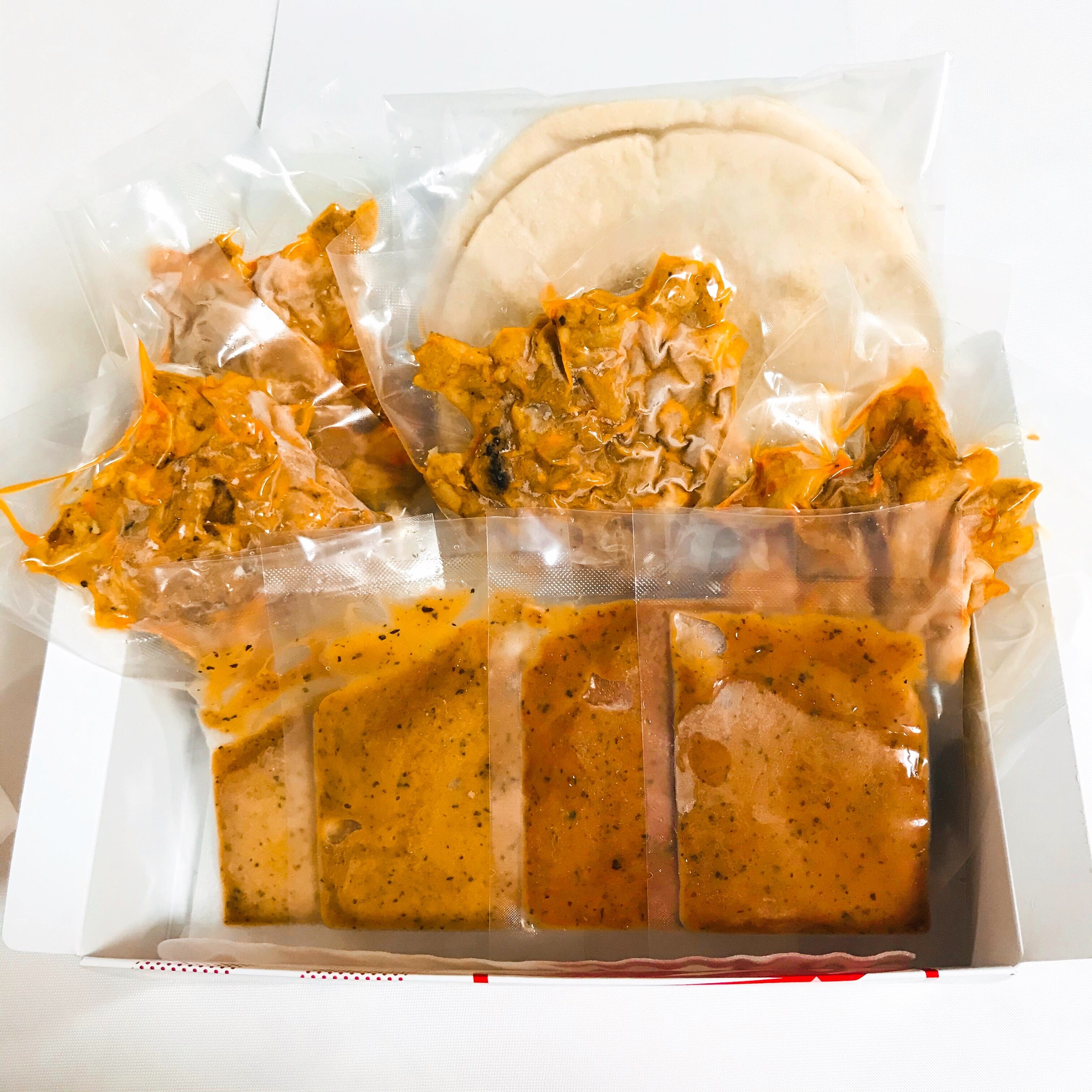 鶏肉を数種類のスパイスやフルーツの入った特製のソースで漬け込んだ本格的なケバブ肉を、加熱後に真空パックにして冷凍してあります。